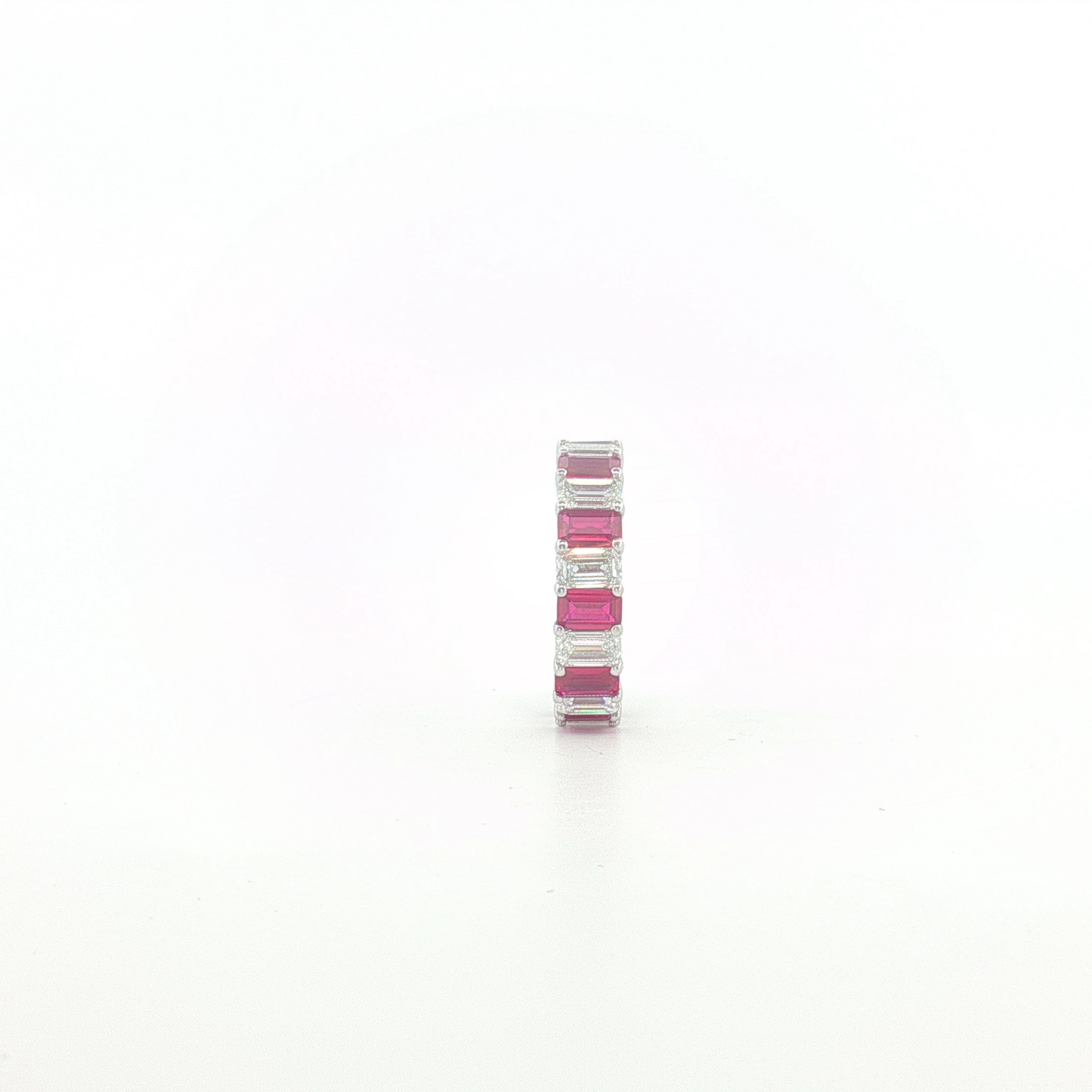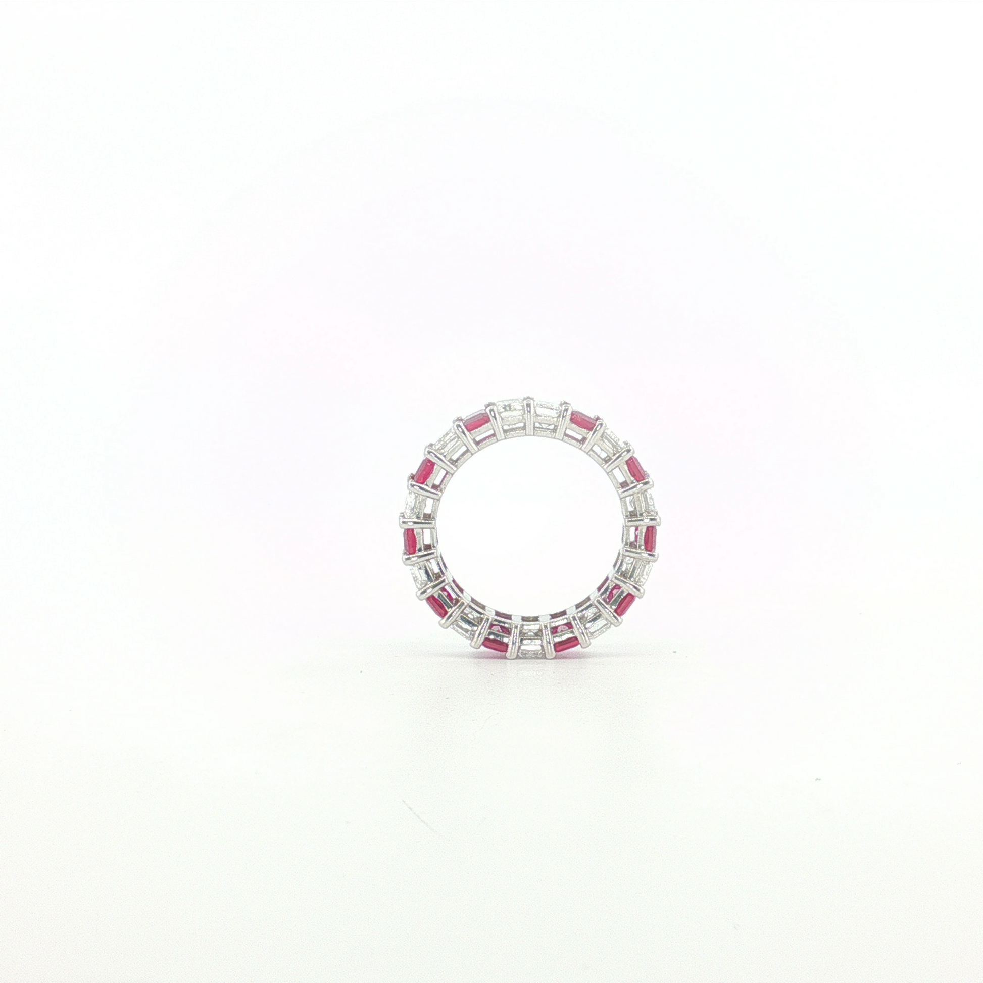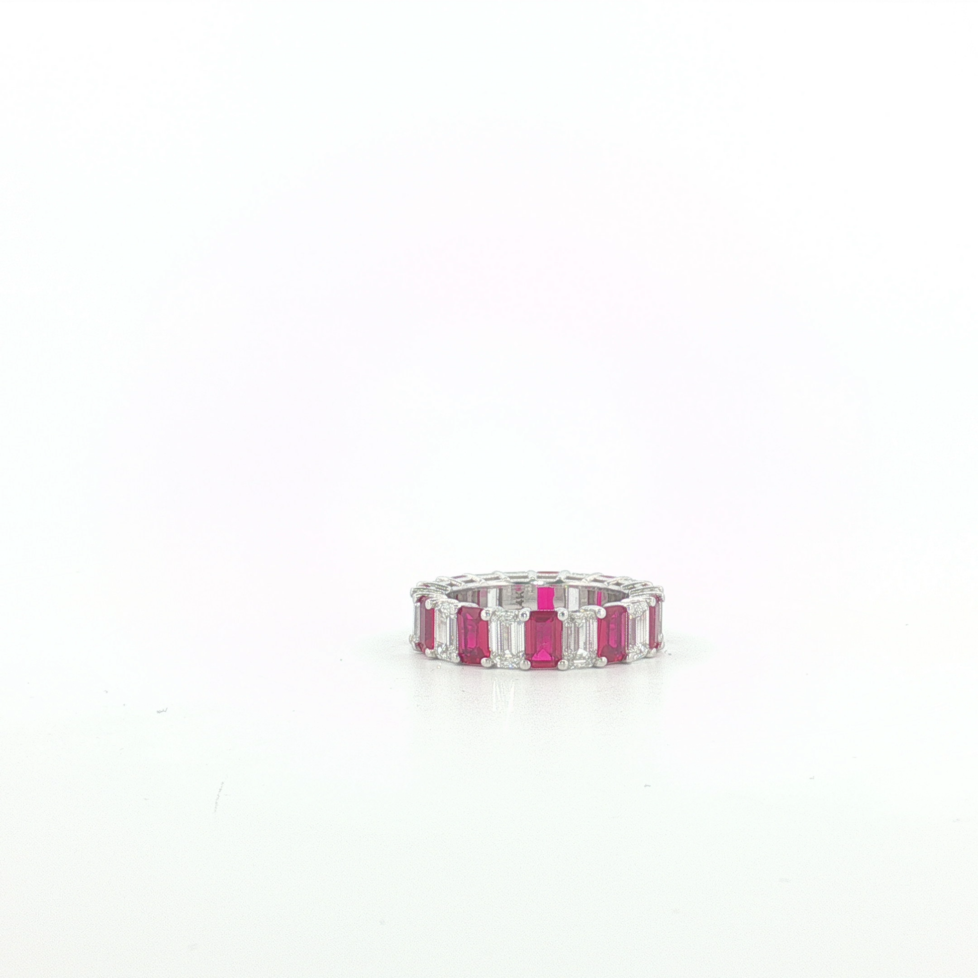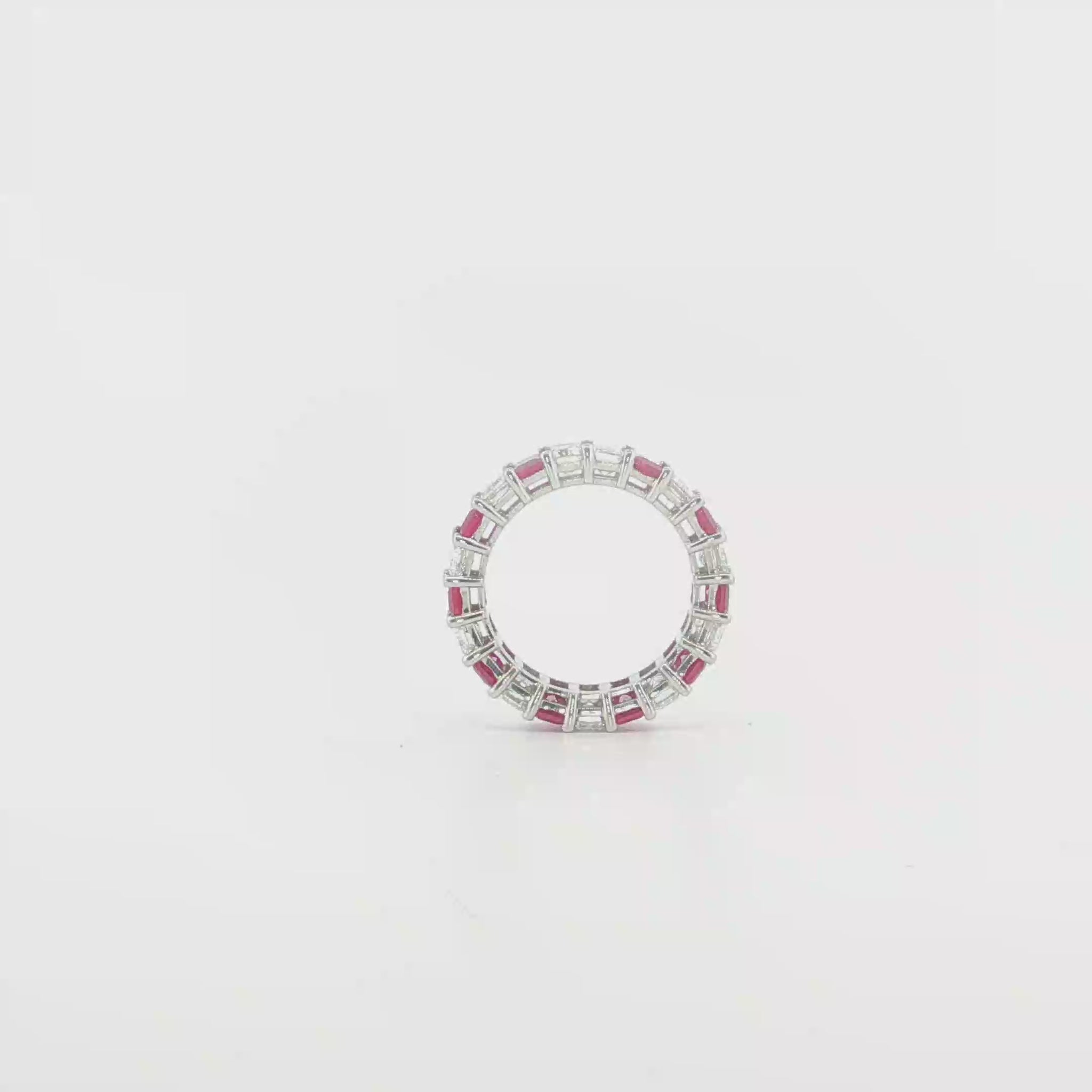 Elevate your style with this exquisite white gold eternity ring, showcasing vibrant red rubies. Each ruby is meticulously step-cut into an emerald shape, set around the silver band. The transparent stones add a touch of sophistication to this timeless piece. This ring offers a seamless blend of classic design and bold color.