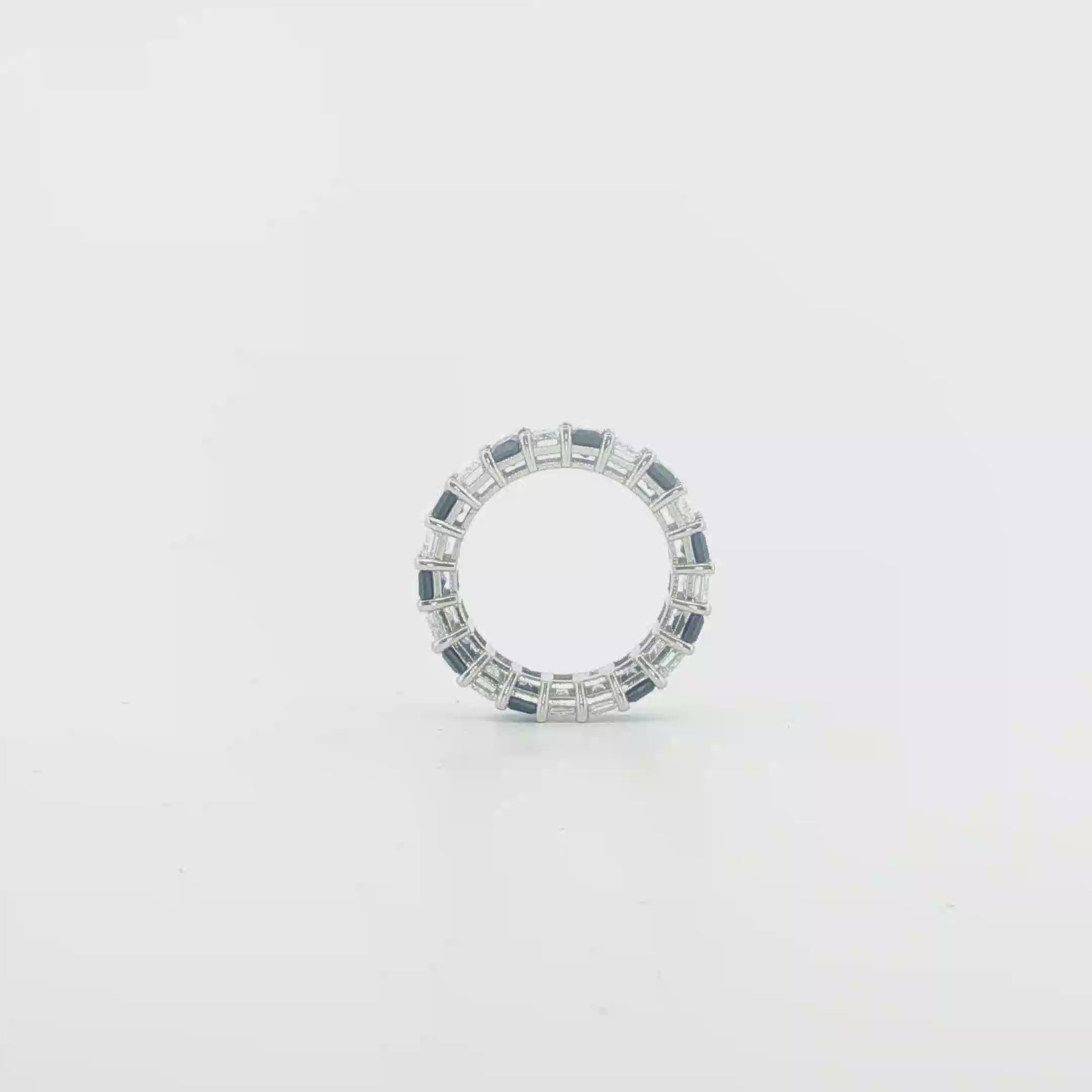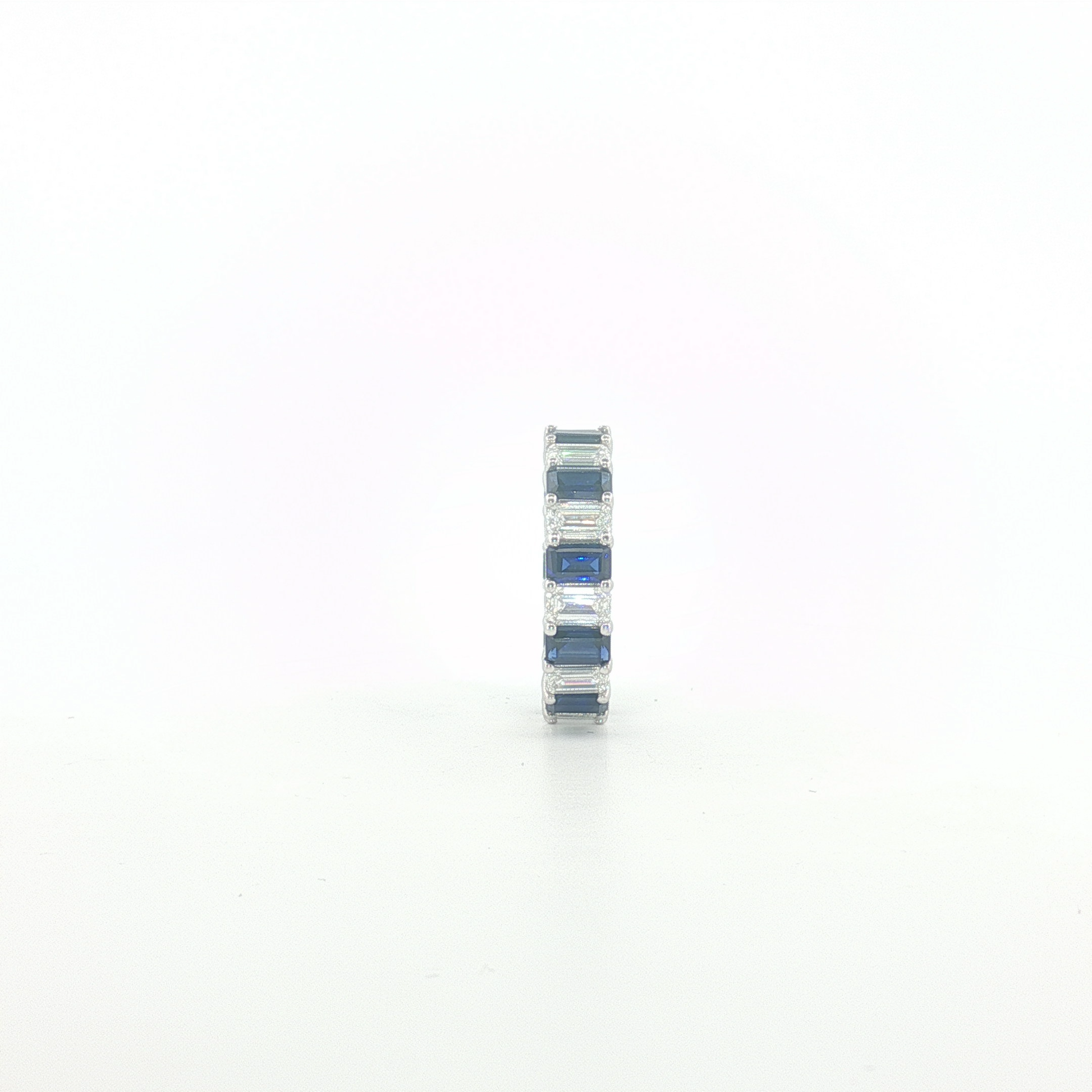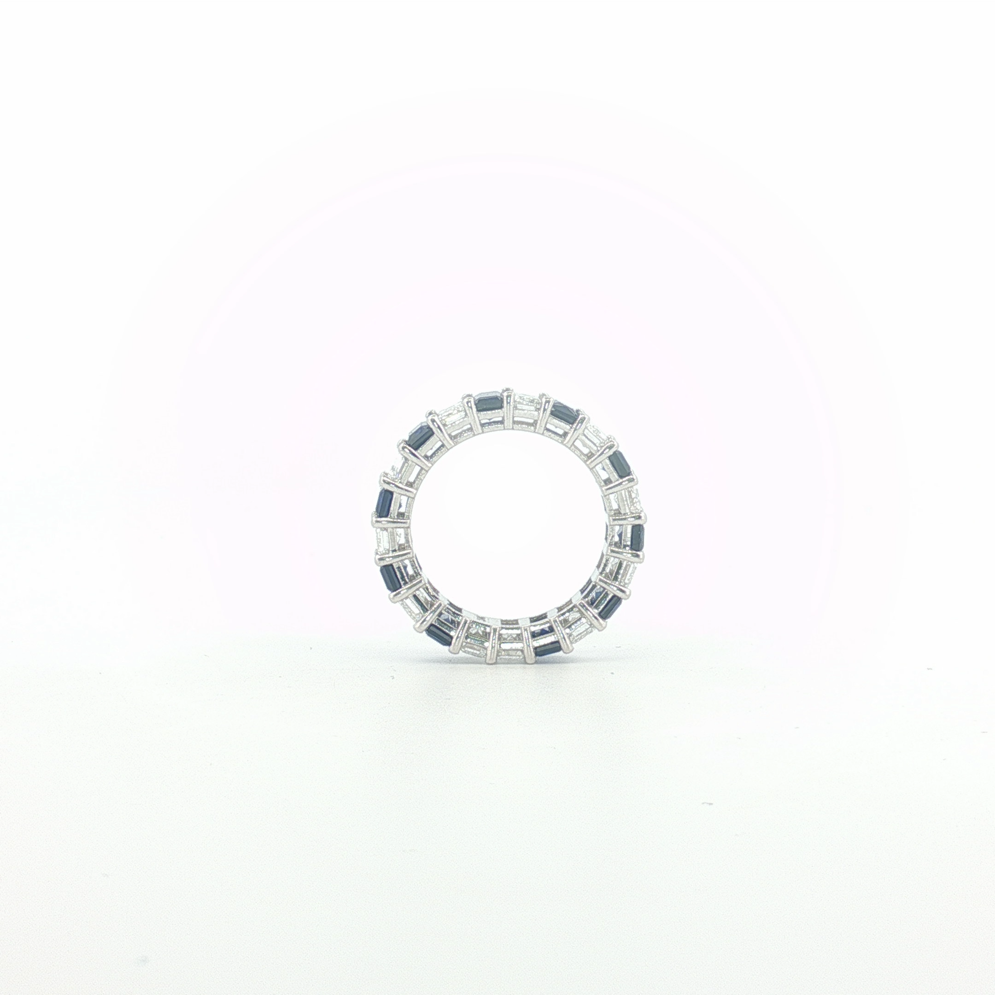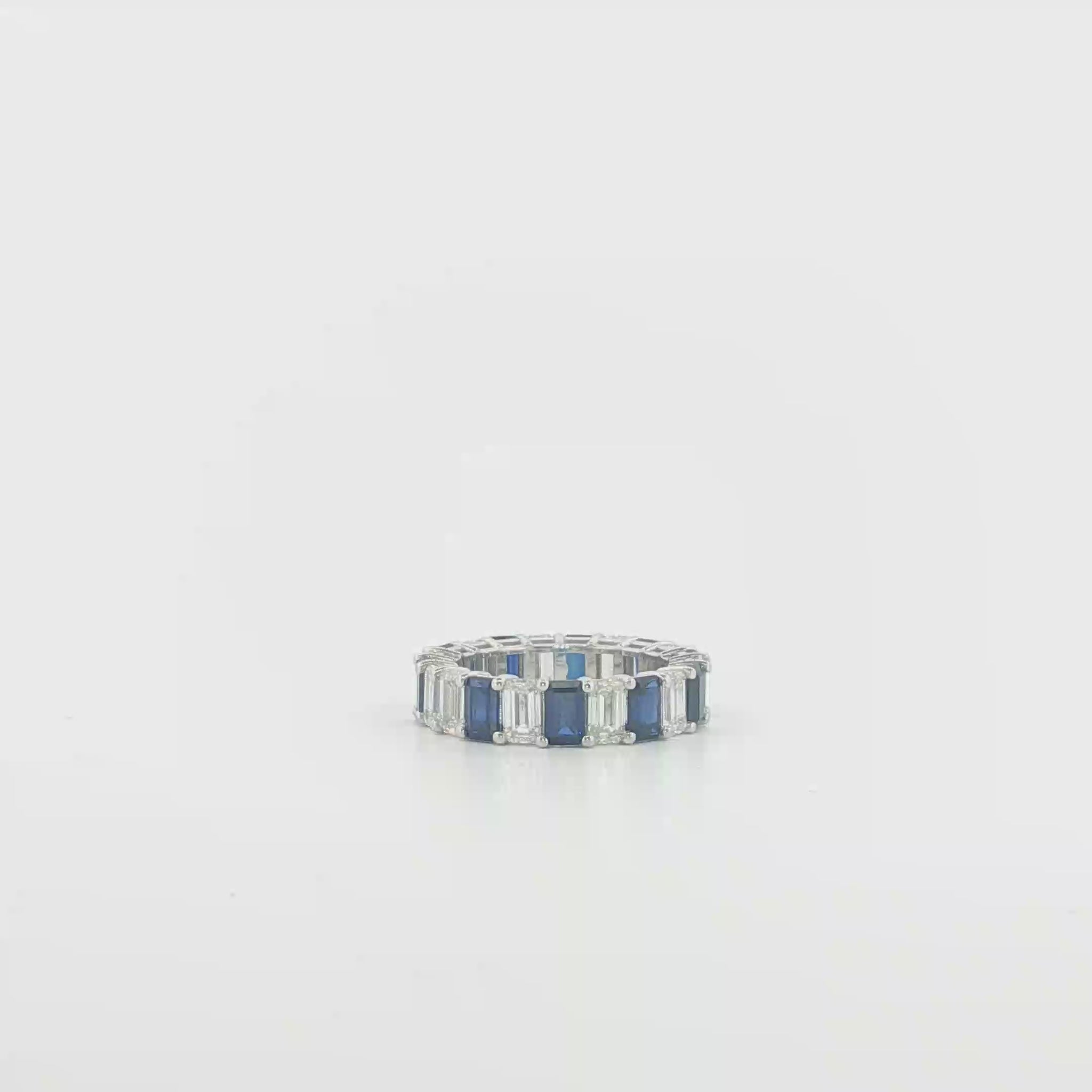 Indulge in the mesmerizing allure of this white gold eternity ring, a continuous circle of elegance. The ring features a series of deep blue emerald cut sapphires, each meticulously step cut. These vibrant sapphires are carefully arranged to create a seamless band of captivating color and scintillation, set in a precious gold base.