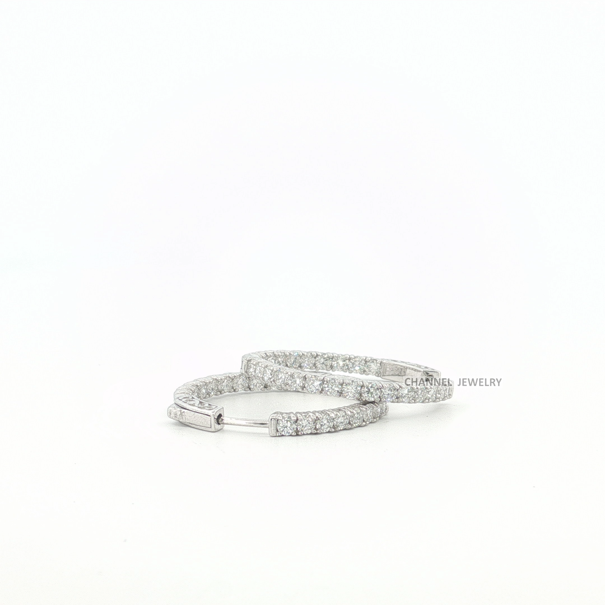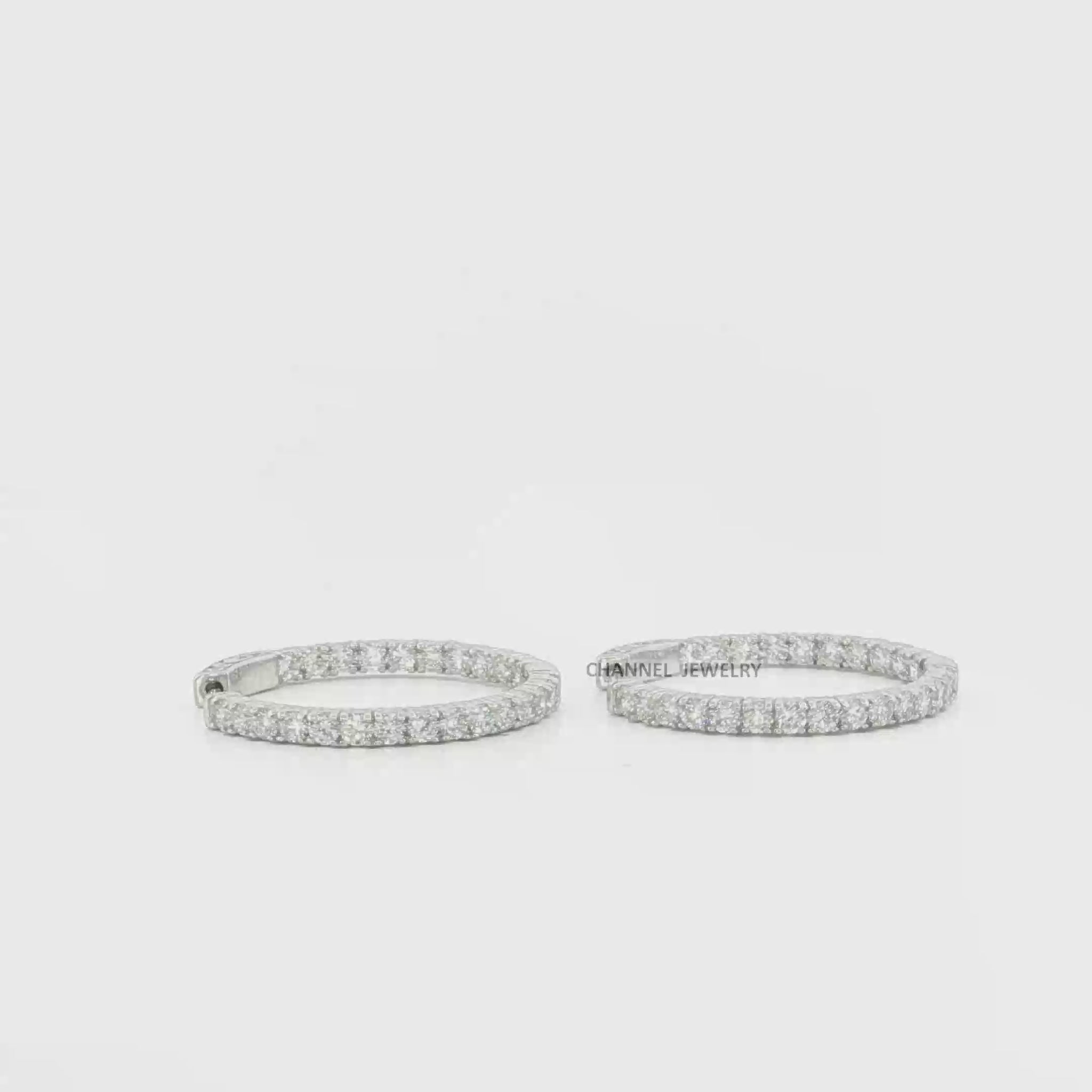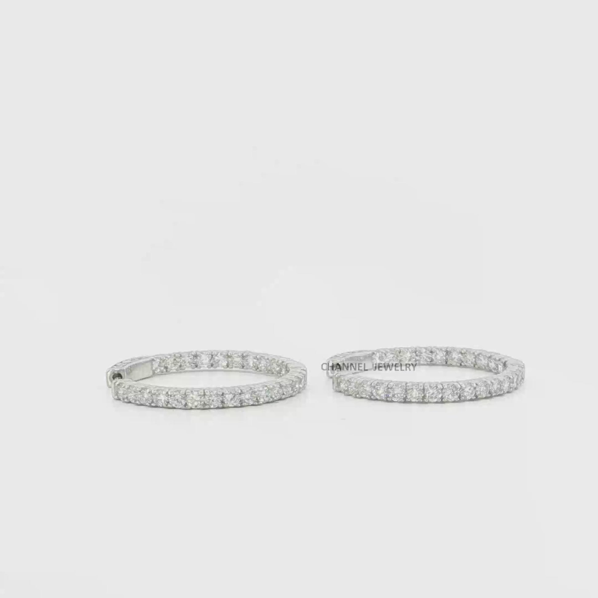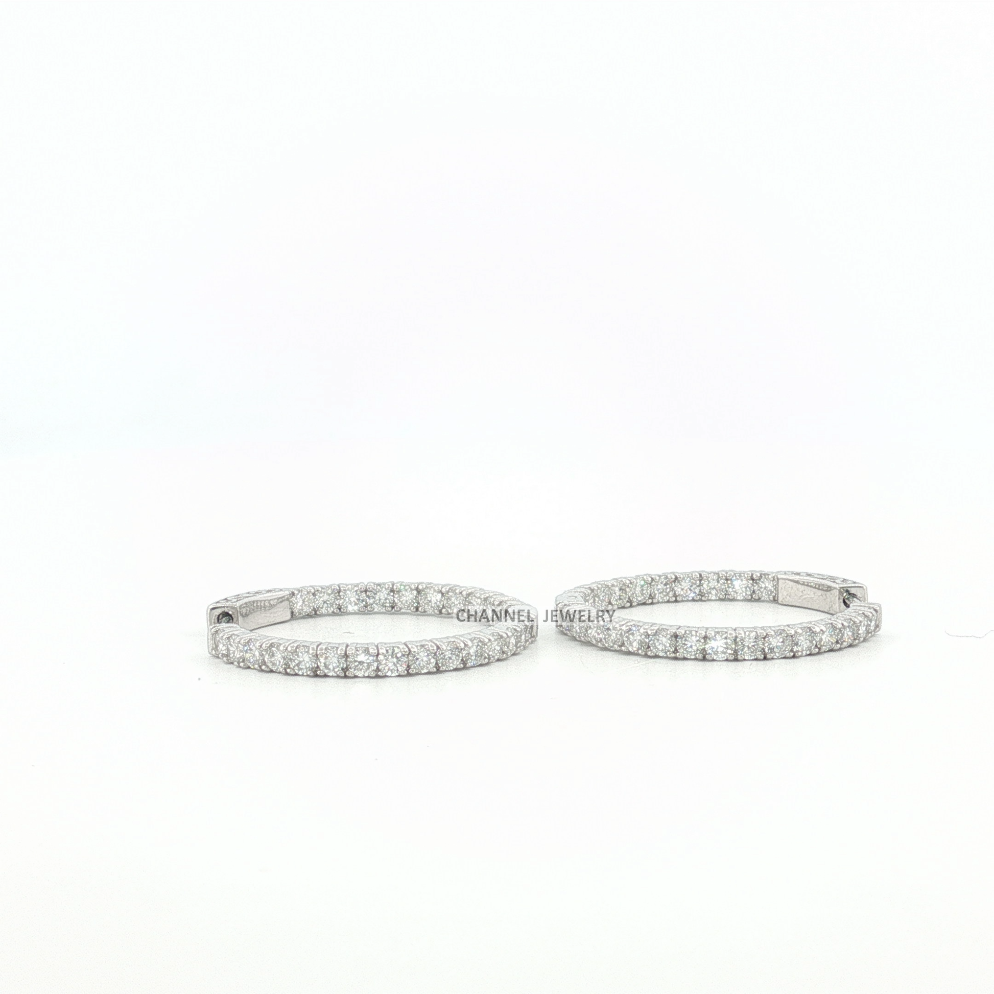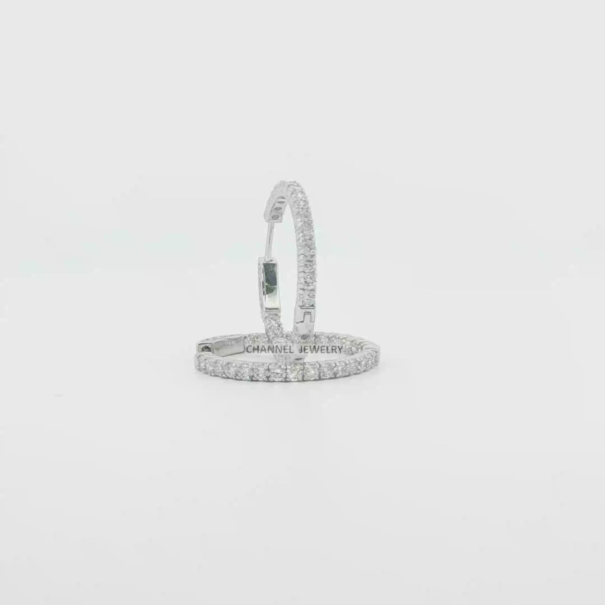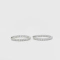 Dazzle in understated elegance with these exquisite white gold hoop earrings. Crafted in lustrous gold, they boast a timeless design. Each earring is meticulously set with round cut diamonds, showcasing brilliant sparkle with every turn. The diamonds are arranged in a secure and refined setting, creating a seamless band of light.