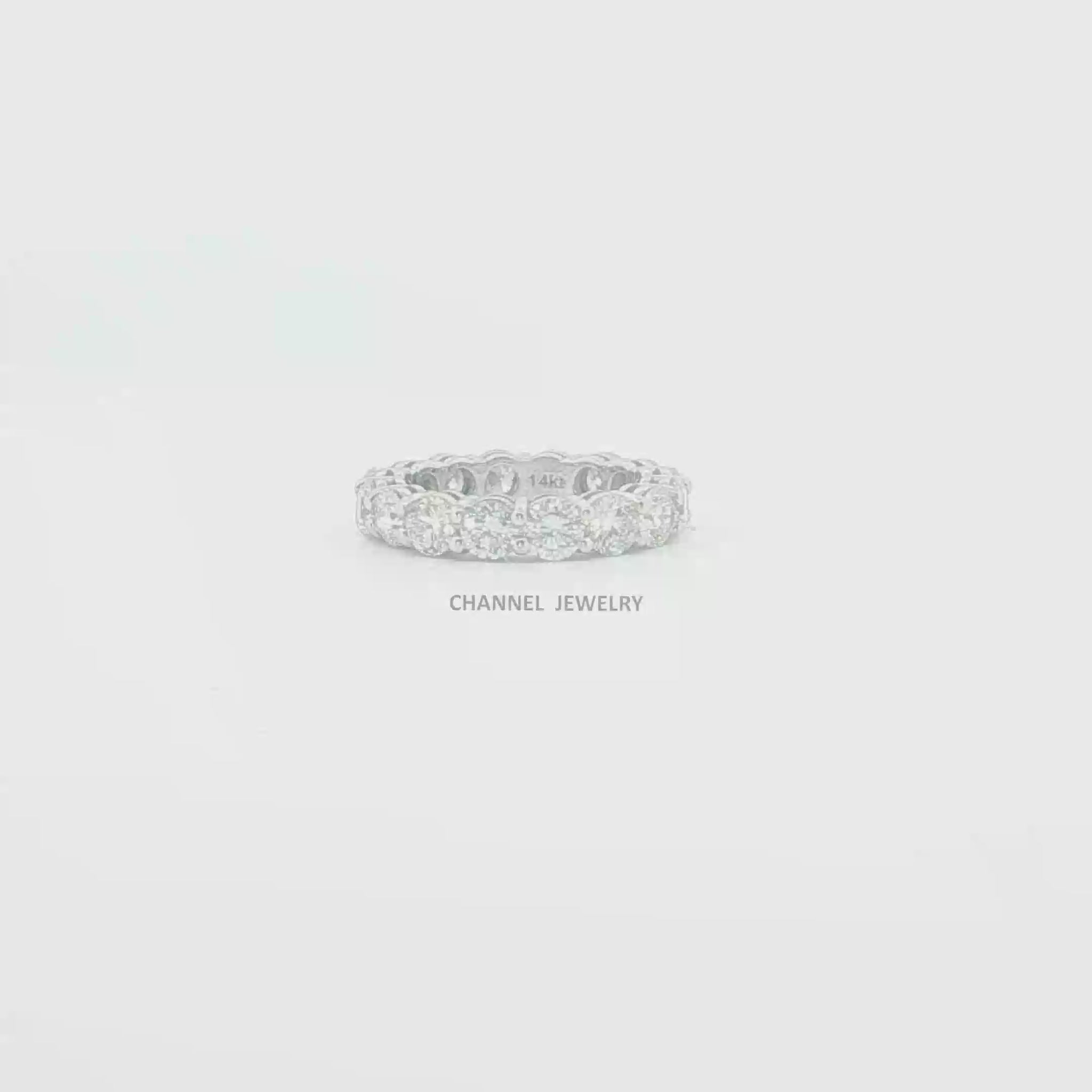 Indulge in timeless elegance with this exquisite eternity ring, crafted from lustrous white gold. Adorned with a continuous array of meticulously cut round diamonds, each stone radiates brilliant fire and scintillation. The diamonds are set in a shared prong setting that allows maximum light to each round stone. The impeccable symmetry of this design creates a mesmerizing display, making it the perfect emblem of everlasting love and commitment.