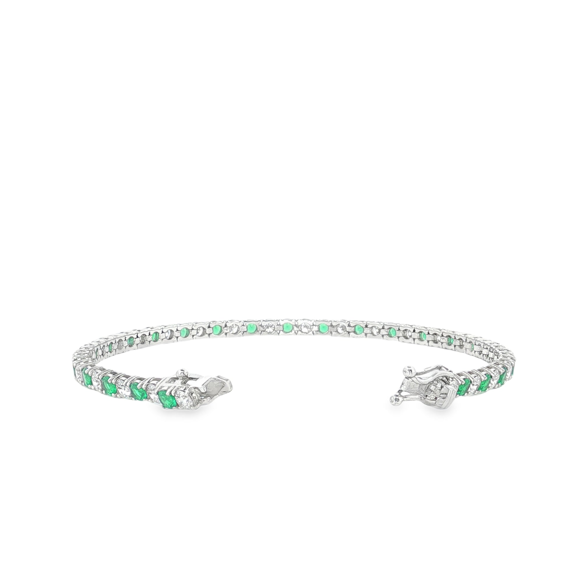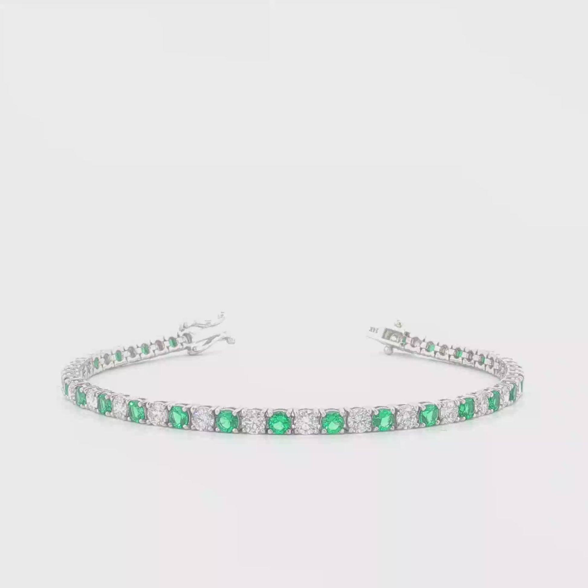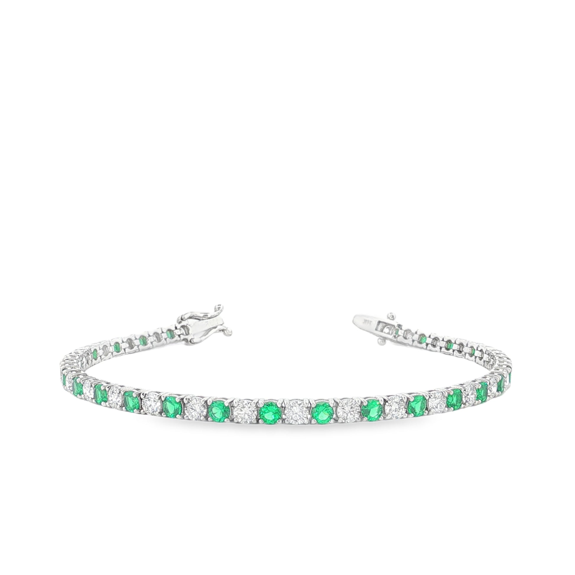 Elegantly crafted, this tennis bracelet showcases the timeless beauty of alternating round-cut emeralds and diamonds set in lustrous white gold. The brilliant faceting of the gemstones complements the vibrant green hues of the emeralds, secured with a finely crafted clasp for a secure and sophisticated statement on the wrist.