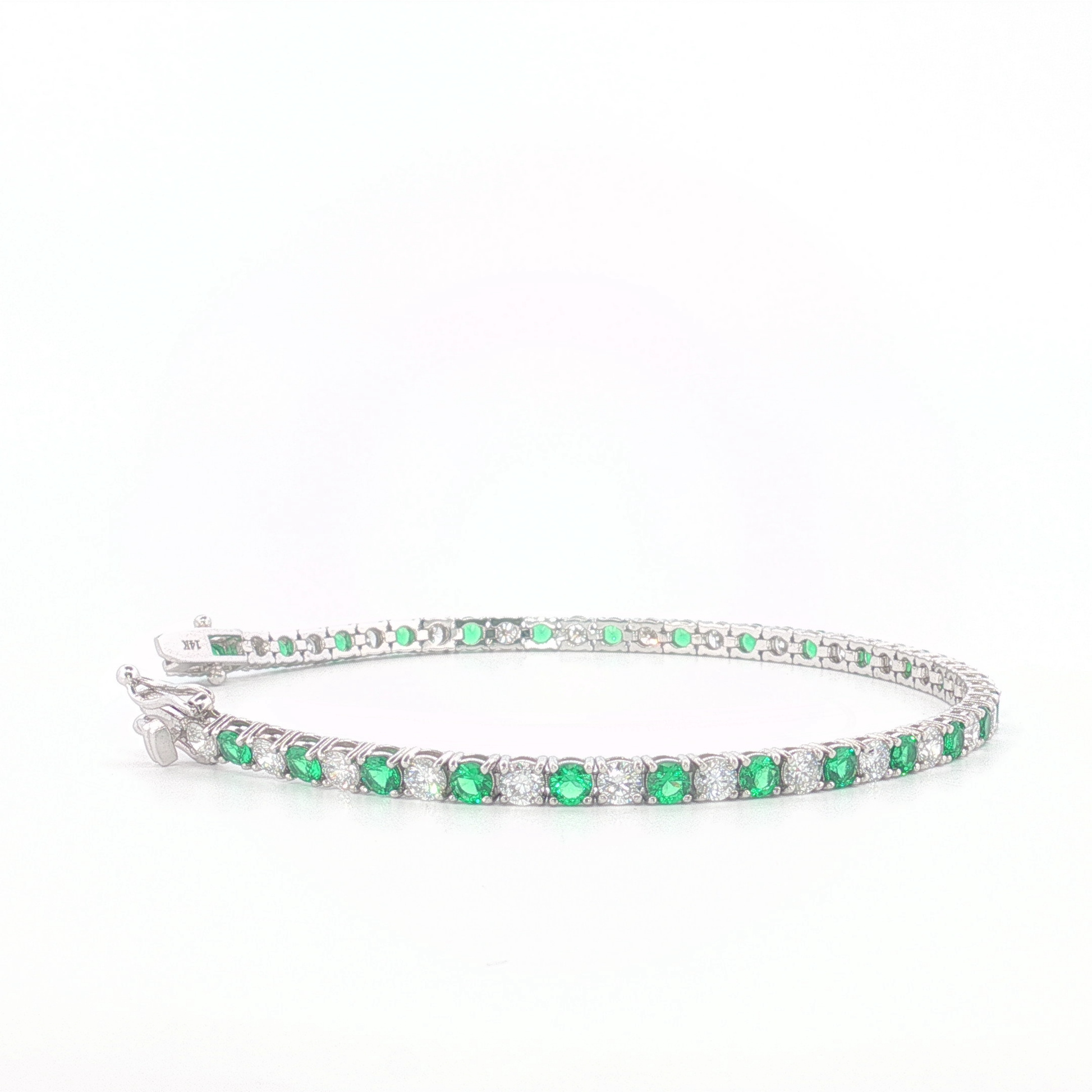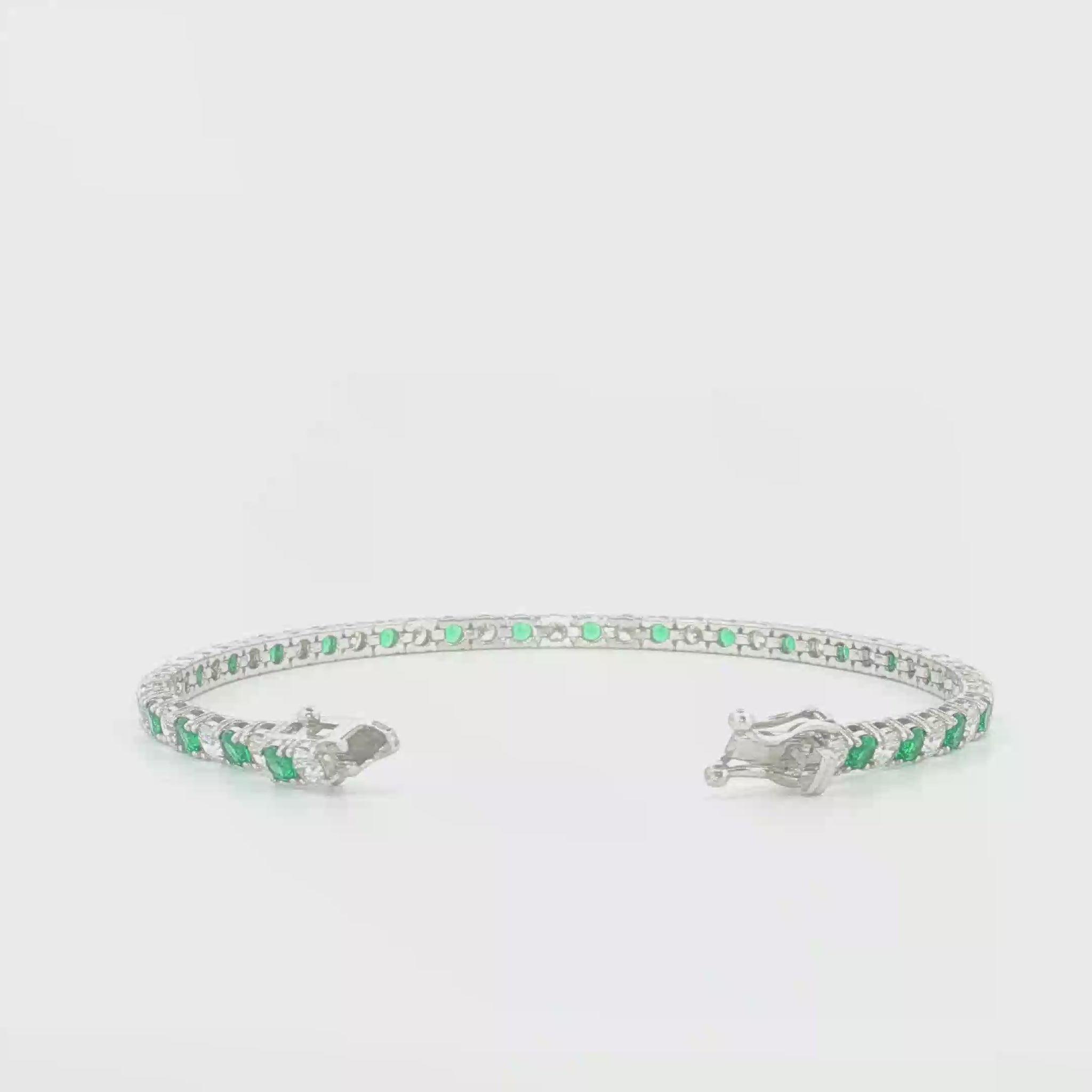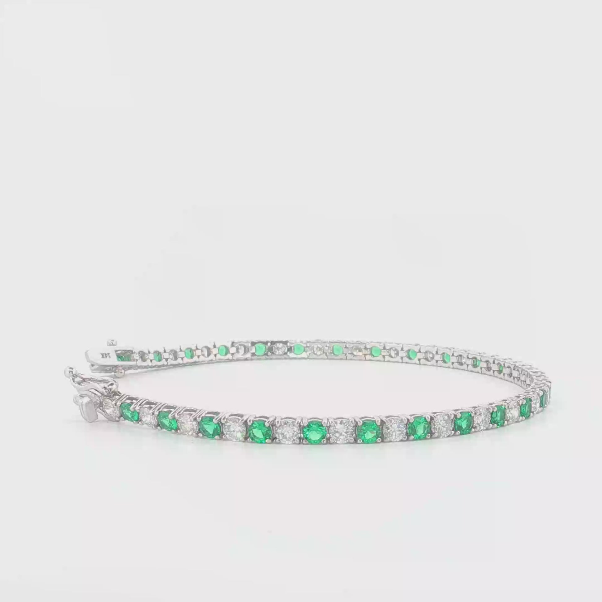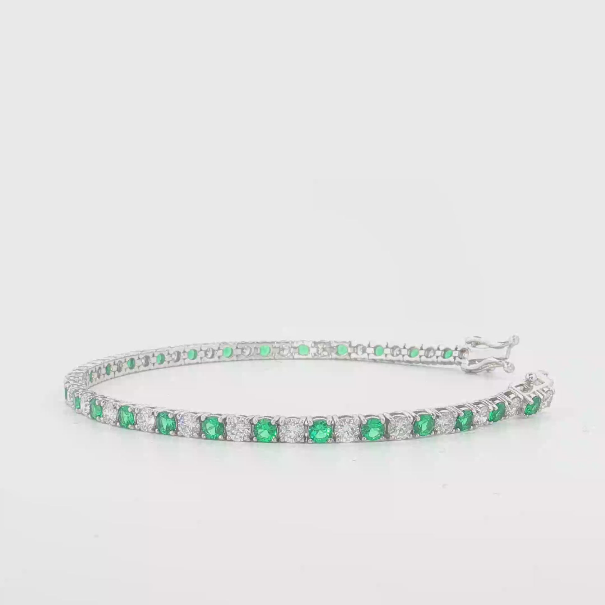 Elegantly crafted, this tennis bracelet showcases the timeless beauty of alternating round-cut emeralds and diamonds set in lustrous white gold. The brilliant faceting of the gemstones complements the vibrant green hues of the emeralds, secured with a finely crafted clasp for a secure and sophisticated statement on the wrist.