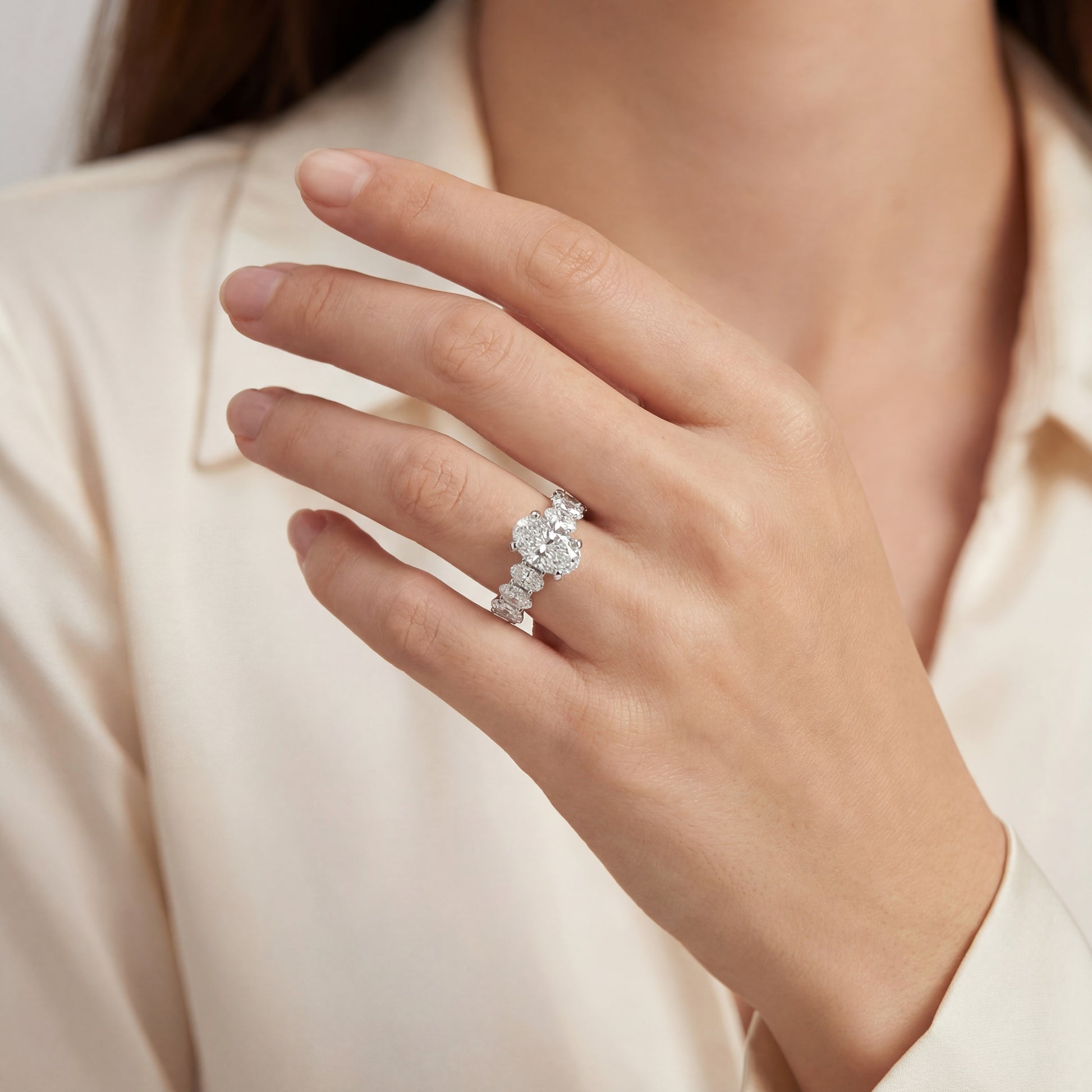 Exquisite 14k multistone ring featuring a prominent oval cut colorless diamond, showcasing brilliant cutting style. The design exemplifies a perfect blend of timeless elegance and modern sophistication, making it a captivating statement piece. Its meticulously crafted setting highlights the exceptional transparency and brilliance of the diamond.