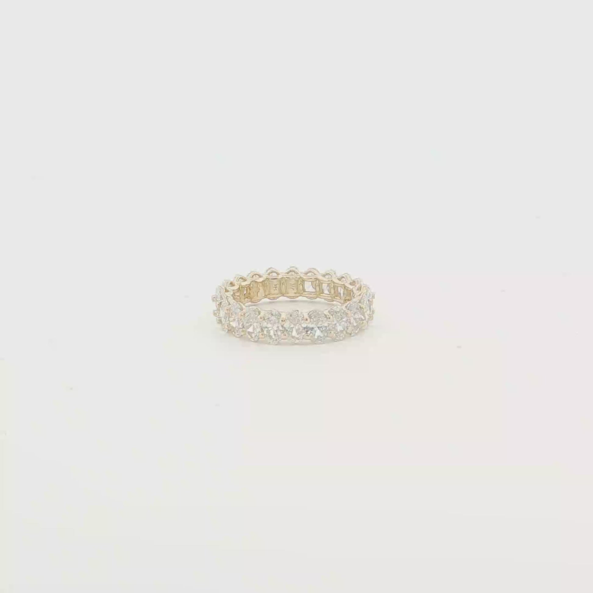 Indulge in the timeless elegance of this exquisite yellow gold eternity ring. Featuring a continuous row of meticulously set oval cut diamonds, each stone is cut with brilliant facets to maximize light reflection and sparkle. The ring's design symbolizes never-ending love and commitment, perfect for anniversaries or as a wedding band.