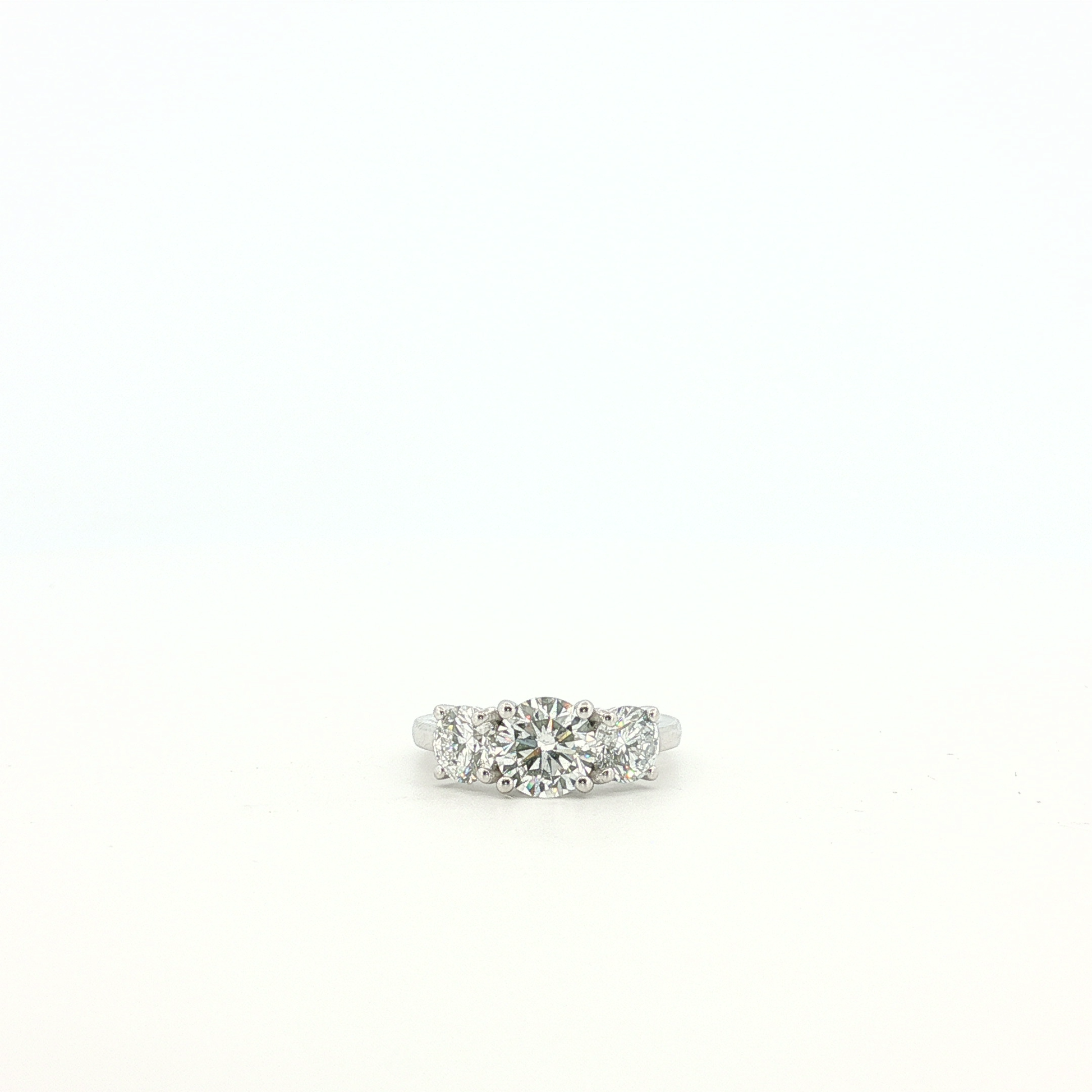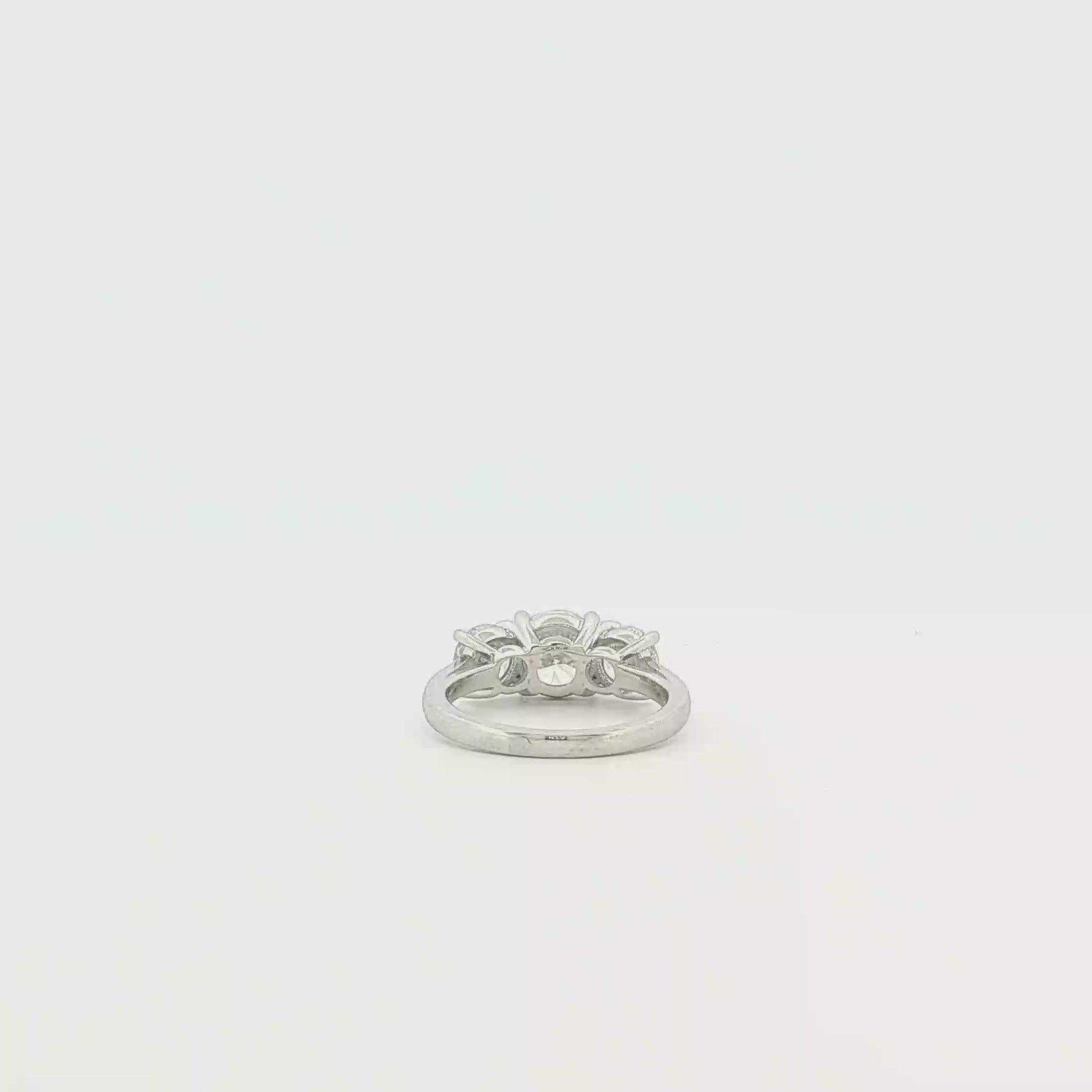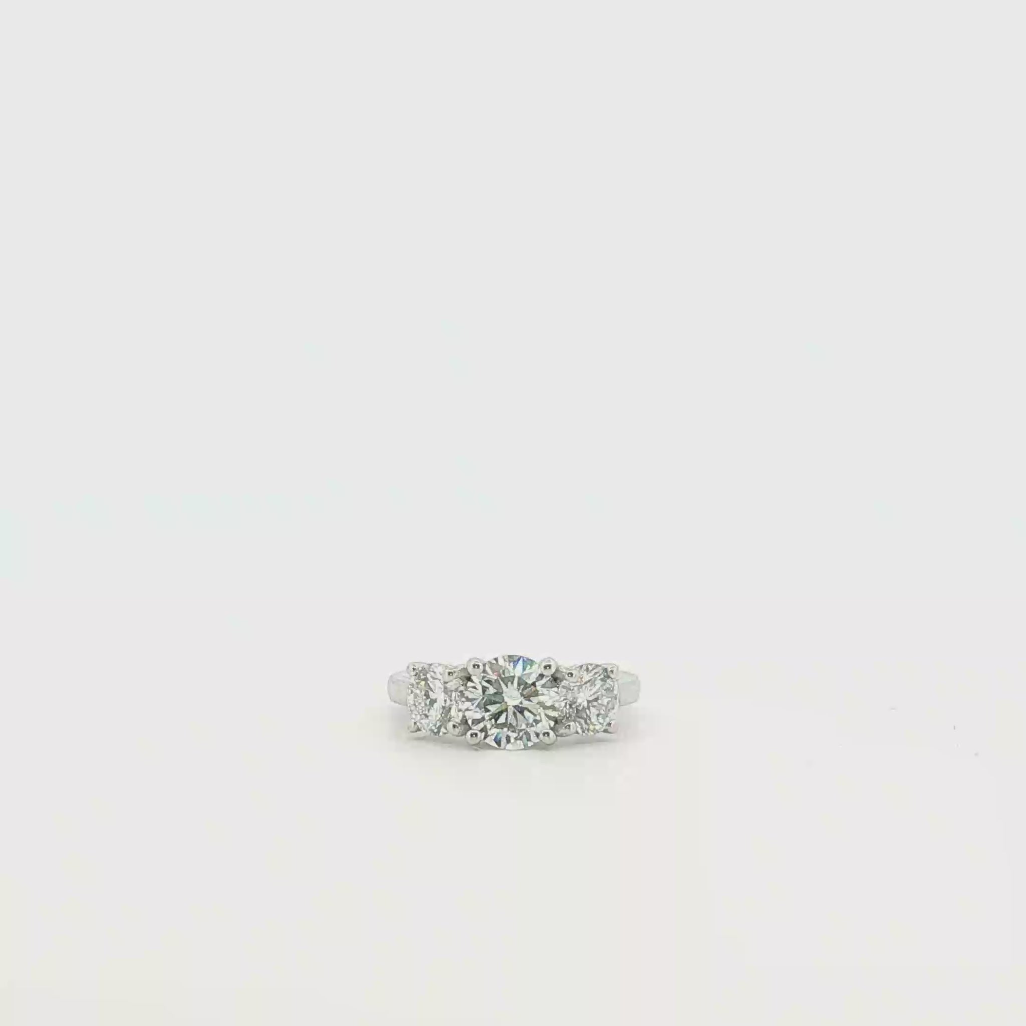 Elegant multistone ring expertly crafted in luminous platinum with a timeless appeal. This stunning ring features a classic three-stone design, each stone exhibiting a brilliant round cut to maximize its fire and scintillation. The white gold prongs accentuate the diamonds' sparkle, offering a harmonious balance of luxury and sophistication.